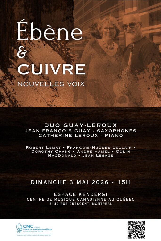 Le Duo Guay-Leroux vous invite à un concert mettant en lumière des œuvres contemporaines pour saxophones et piano, dans un programme riche et expressif intitulé Ébène & Cuivre – Nouvelles voix.